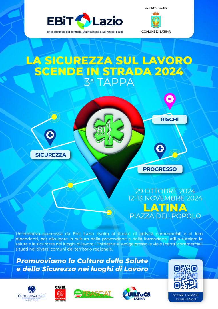 Ancora una tappa regionale, la terza, per l’iniziativa “La sicurezza sul lavoro scende in strada” organizzata da Ebit Lazio, l’ente bilaterale del Terziario, Distribuzione e Servizi del Lazio. Questa volta l’evento andrà in scena a Latina, con il patrocinio del Comune, nelle giornate di martedì 29 ottobre e martedì 12 e mercoledì 13 novembre. “La sicurezza sul lavoro scende in strada – riferiscono gli organizzatori - è un’iniziativa rivolta ai titolari di attività commerciali e ai loro dipendenti, per divulgare la cultura della prevenzione e della formazione utili a tutelare la salute e la sicurezza nei luoghi di lavoro. L’iniziativa si svolge presso le vie e i centri commerciali situati nei diversi comuni”. Le prime due tappe sono state nel V Municipio di Roma (dal 28 al 30 maggio scorsi) e presso il X Municipio di Ostia (10 e 11 luglio) e sono state patrocinate dai rispettivi Municipi. Anche a Latina sono previste numerose iniziative, tra le quali la distribuzione di materiale informativo, la consegna di kit di primo soccorso, lo svolgimento di corsi di formazione e check-up gratuiti dell’attività in ambito di sicurezza. Per il vicepresidente di Ebit Lazio, Vittorio Pezzotti, l’iniziativa “ha come obiettivo quello di sensibilizzare tutti gli addetti ai lavori sul tema della salute e sicurezza nei luoghi di lavoro, grazie all’incontro e al confronto con tantissimi datori di lavoro e lavoratori”.